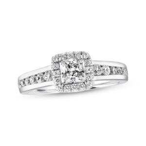 A gorgeous symbol of your love, this sparkling bridal set from features an engagement ring with a romantic heart-shaped diamond haloed by glimmering round diamonds. The band and matching wedding ring are adorned with twists of round diamonds, bringing the total weight of the set to 7/8 carat. The ring is styled in 14K white gold.