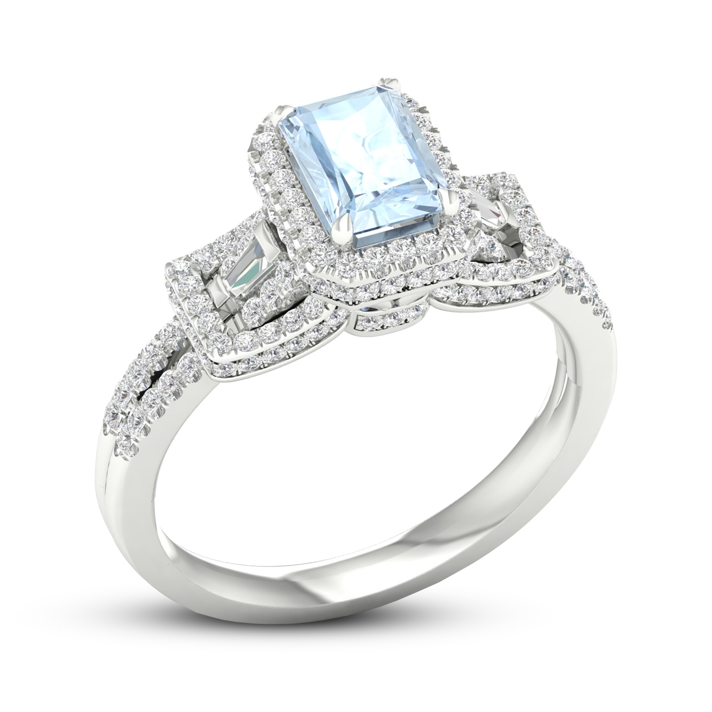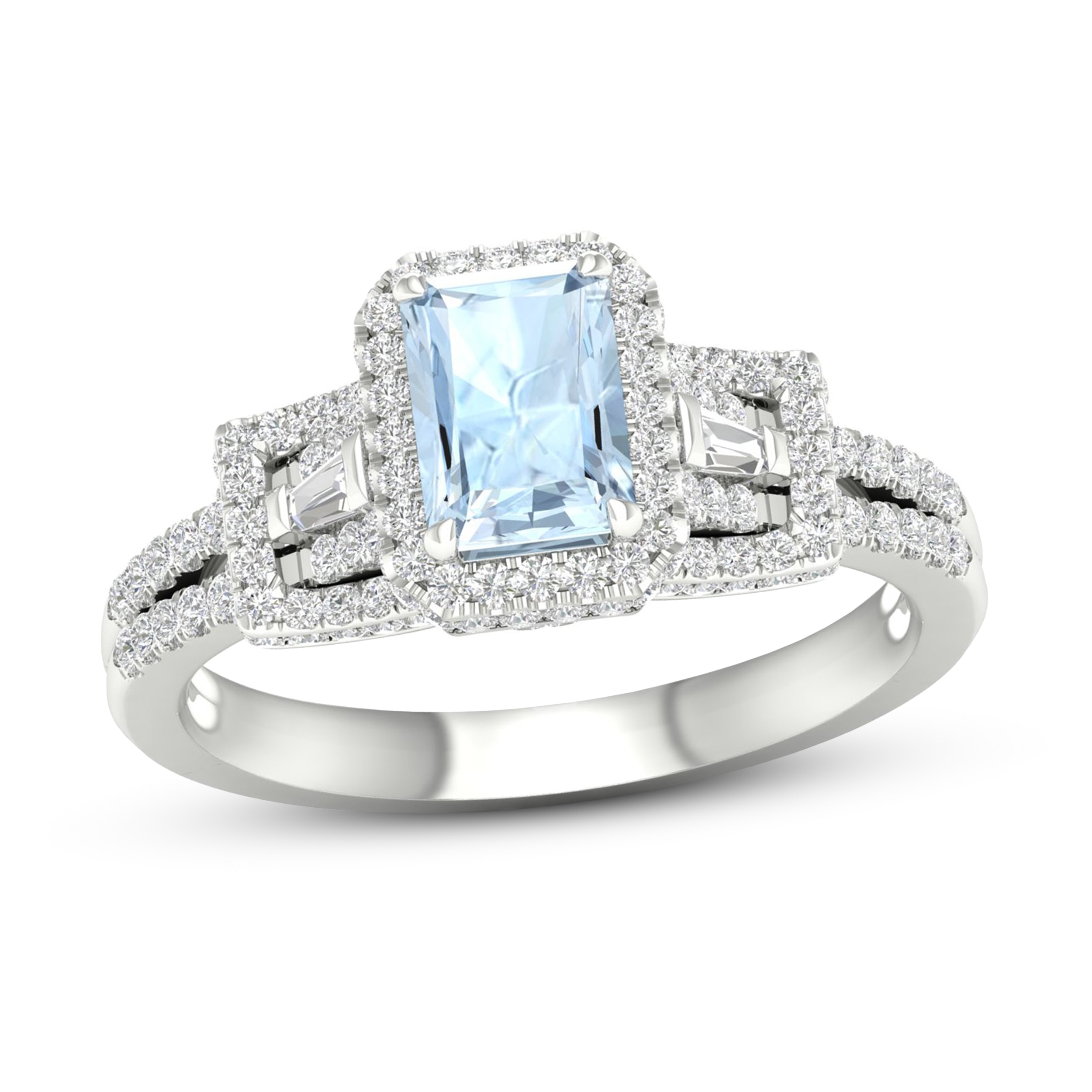 Aquamarine & Diamond Engagement Ring 1/2 ct tw Emerald/Round/Baguette-cut 10K White Gold